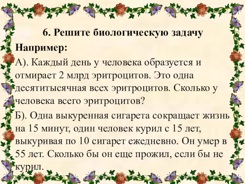 Б). Одна выкуренная сигарета сокращает жизнь на 15 минут, один человек курил с 15 лет, выкуривая по 10 сигарет ежедневно. Он умер в 55 лет. Сколько бы он еще прожил, если бы не курил.
