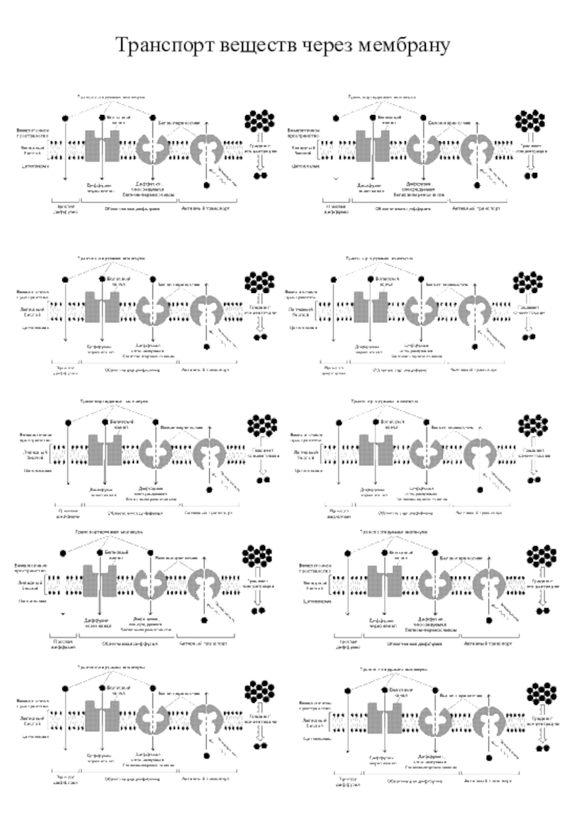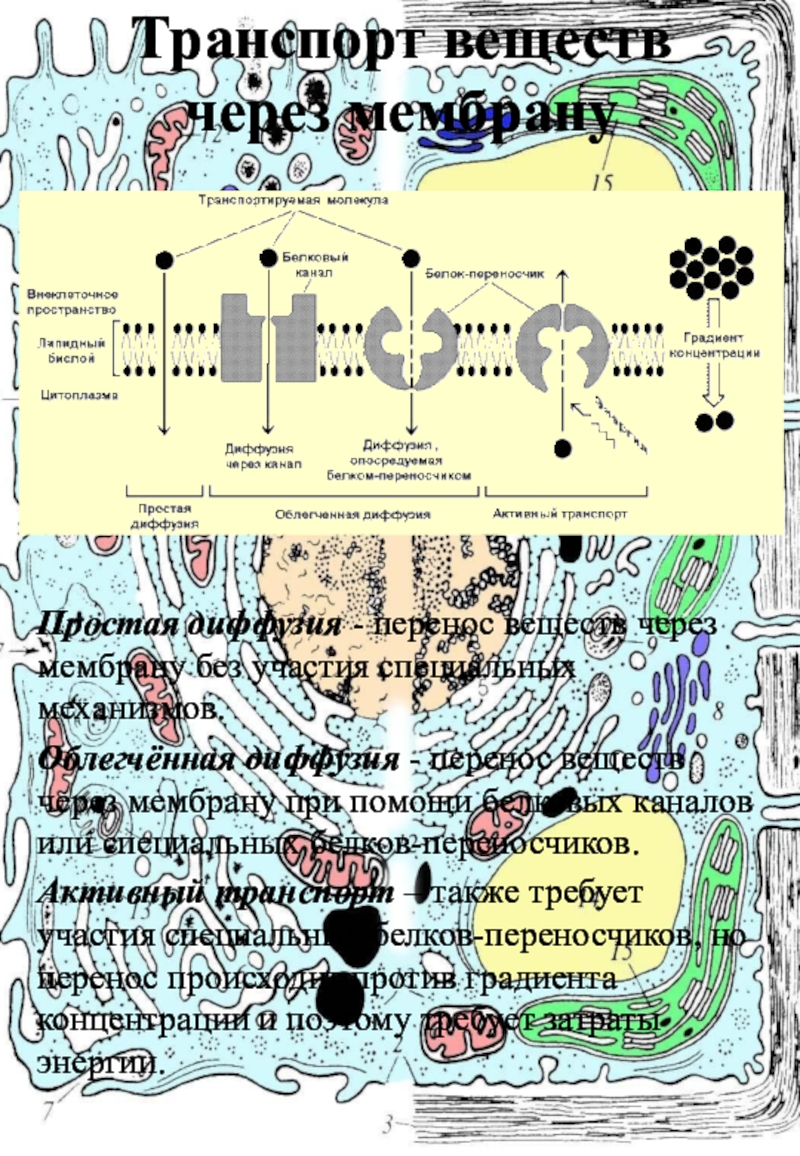 Активный транспорт – также требует участия специальных белков-переносчиков, но перенос происходит против градиента концентрации и поэтому требует затраты энергии.