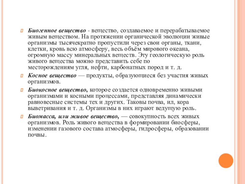 Слайд 5Биогенное вещество - вещество, создаваемое и перерабатываемое живым веществом. На протяжении органической эволюции