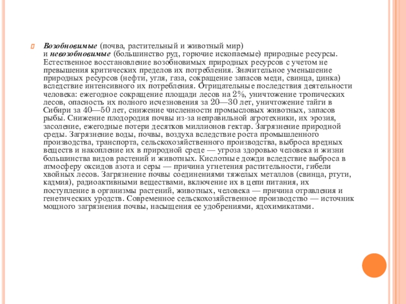 Естественное восстановление возобновимых природных ресурсов с учетом не превышения критических пределов их потребления. Значительное уменьшение природных ресурсов (нефти, угля, газа, сокращение запасов меди, свинца, цинка) вследствие интенсивного их потребления. Отрицательные последствия деятельности человека: ежегодное сокращение площади лесов на 2%, уничтожение тропических лесов, опасность их полного исчезновения за 20—30 лет, уничтожение тайги в Сибири за 40—50 лет, снижение численности промысловых животных, запасов рыбы. Снижение плодородия почвы из-за неправильной агротехники, их эрозия, засоление, ежегодные потери десятков миллионов гектар. Загрязнение природной среды. Загрязнение воды, почвы, воздуха вследствие роста промышленного производства, транспорта, сельскохозяйственного производства, выброса вредных веществ и накопление их в природной среде — угроза здоровью человека и жизни большинства видов растений и животных. Кислотные дожди вследствие выброса в атмосферу оксидов азота и серы — причина угнетения растительности, гибели хвойных лесов. Загрязнение почвы соединениями тяжелых металлов (свинца, ртути, кадмия), радиоактивными веществами, включение их в цепи питания, их поступление в организмы растений, животных, человека — причина отравления и генетических уродств. Современное сельскохозяйственное производство — источник мощного загрязнения почвы, насыщения ее удобрениями, ядохимикатами.