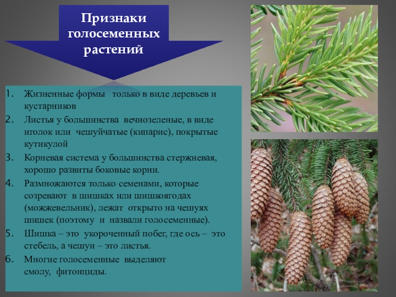 Размножаются только семенами, которые созревают в шишках или шишкоягодах (можжевельник), лежат открыто на чешуях шишек (поэтому и назвали голосеменные).