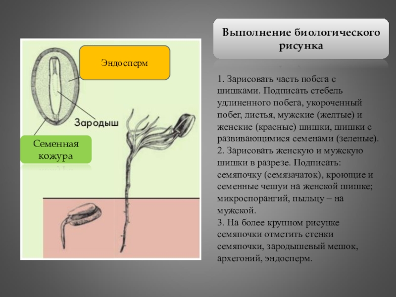 Слайд 311. Зарисовать часть побега с шишками. Подписать стебель удлиненного побега, укороченный