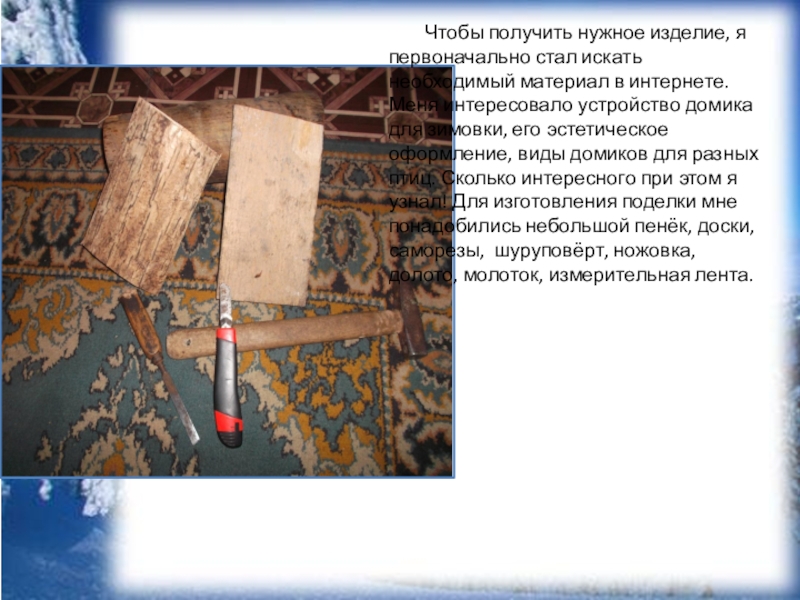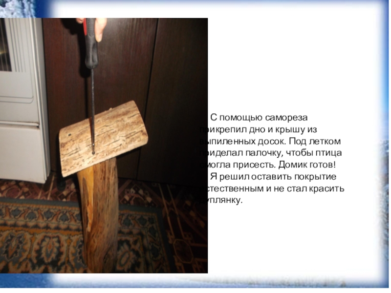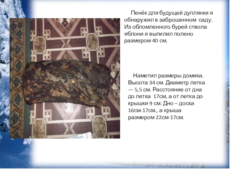 Наметил размеры домика. Высота 34 см. Диаметр летка — 5,5 см. Расстояние от дна до летка 17см, а от летка до крышки 9 см. Дно – доска 16см-17см., а крыша размером 22см-17см.
