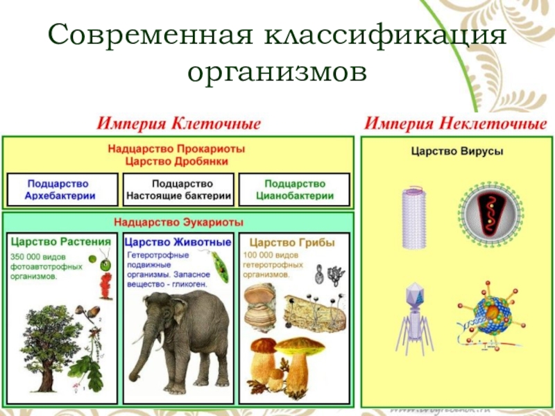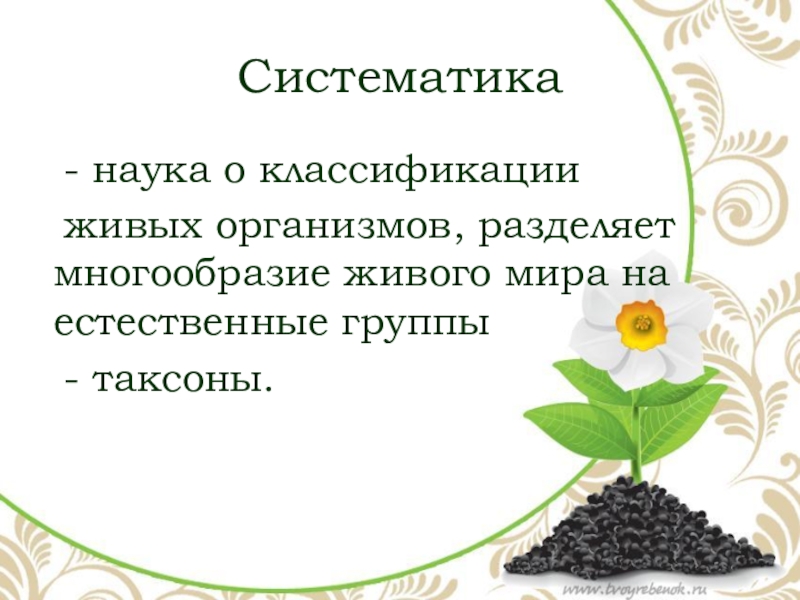Систематика	- наука о классификации 	живых организмов, разделяет многообразие живого мира на естественные группы	- таксоны.