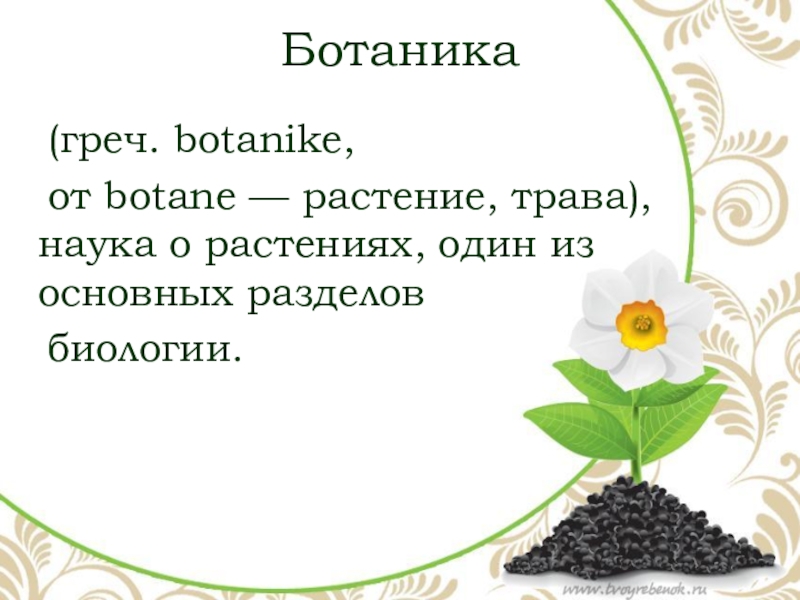 Ботаника	(греч. botanike, 	от botane — растение, трава), наука о растениях, один из основных разделов	биологии.