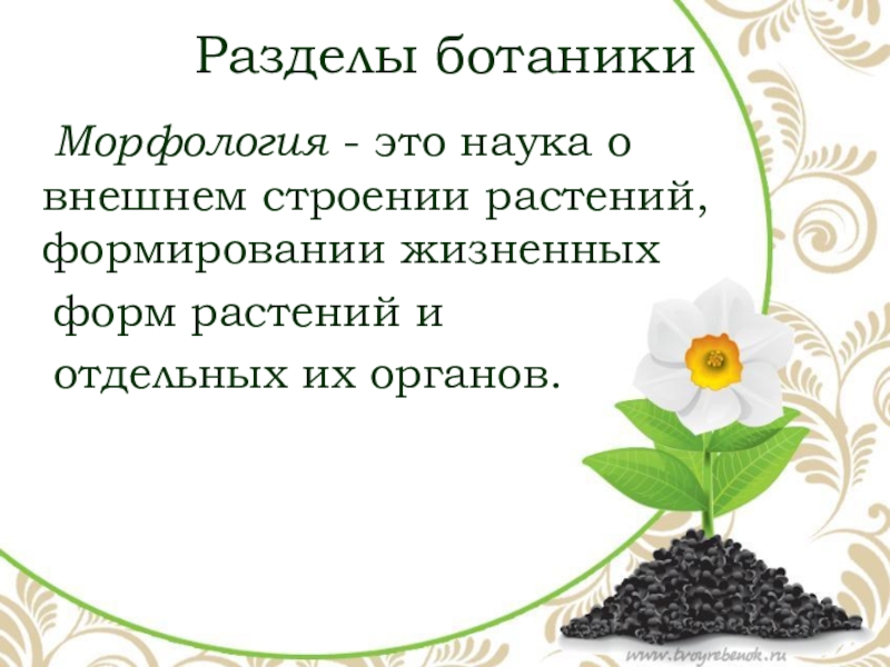 Разделы ботаники	Морфология - это наука о внешнем строении растений, формировании жизненных	форм растений и 	отдельных их органов.