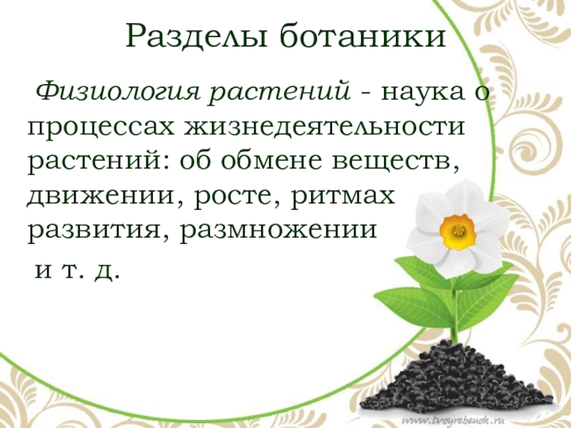 Разделы ботаники	Физиология растений - наука о процессах жизнедеятельности растений: об обмене веществ, движении, росте, ритмах развития, размножении 	и