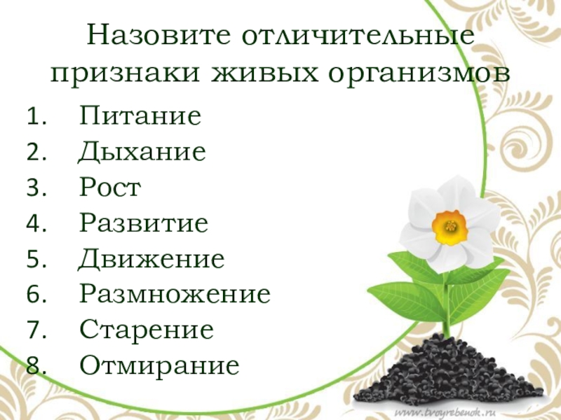 Назовите отличительные признаки живых организмовПитаниеДыханиеРостРазвитиеДвижениеРазмножениеСтарение Отмирание