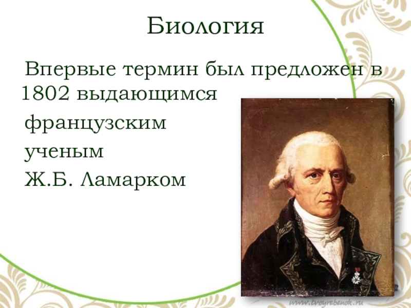 Биология 	Впервые термин был предложен в 1802 выдающимся	французским	ученым 	Ж.Б. Ламарком