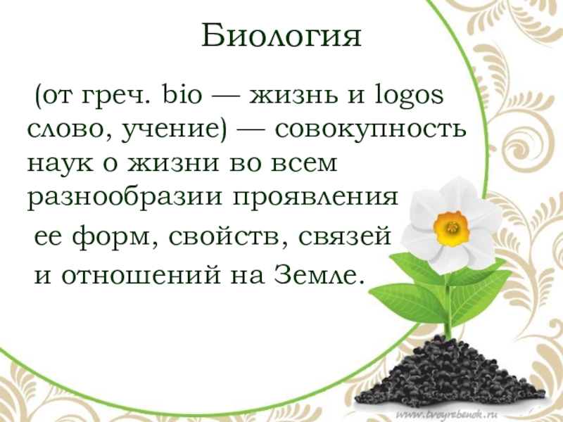 Биология 	(от греч. bio — жизнь и logos слово, учение) — совокупность наук о жизни во всем