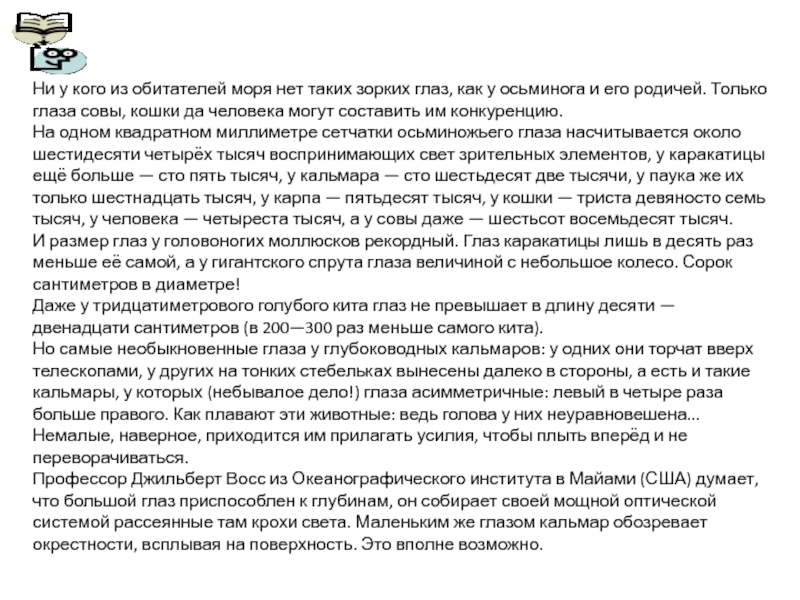 у осьминога и его родичей. Только глаза совы, кошки да человека могут составить им конкуренцию.