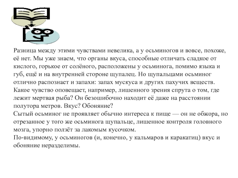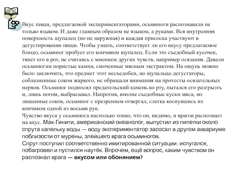 главным образом не языком, а руками. Вся внутренняя поверхность щупалец (но не наружная) и каждая присоска участвуют в дегустировании пищи. Чтобы узнать, соответствует ли его вкусу предлагаемое блюдо, осьминог пробует его кончиком щупалец. Если это съедобный кусочек, тянет его в рот, не считаясь с мнением других чувств, например осязания. Давали осьминогам пористые камни, смоченные мясным экстрактом. На ощупь можно было заключить, что предмет этот несъедобен, но щупальца-дегустаторы, соблазненные соком жаркого, не обращали внимания на протесты осязательных нервов. Осьминог подносил предательский камень ко рту, пытался его разгрызть и, лишь потом, выбрасывал. Напротив, вполне съедобные куски мяса, но лишенные соков, осьминог с презрением отвергал, слегка коснувшись их кончиком одной из восьми рук.