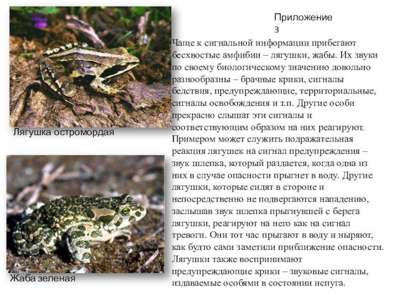 Когда лягушка всматривается в окружающую обстановку, ее мозг не принимает повторяющиеся сигналы о каждой точке предмета, но усиливает изменяющиеся сигналы. Поэтому ползущее насекомое лягушка видит все отчетливее, а неподвижный субстрат — все слабее. Такая работа глаза и мозга позволяет лягушке преодолевать покровительственную окраску насекомых. Зато от лягушки легко уберечься, если сидеть неподвижно.