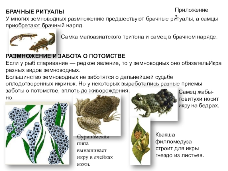 Большинство земноводных не заботятся о дальнейшей судьбе оплодотворенных икринок. Но у некоторых выработались разные приемы заботы о потомстве, вплоть до живорождения.