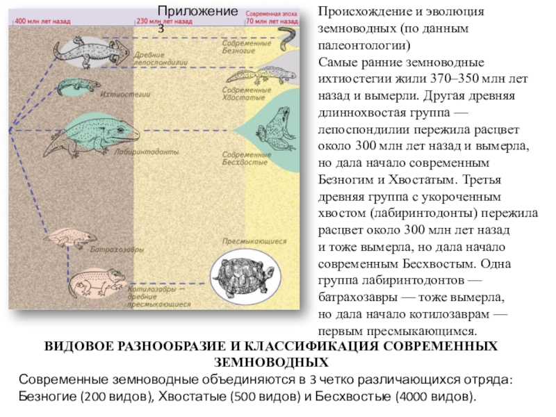 Современные земноводные объединяются в 3 четко различающихся отряда: Безногие (200 видов), Хвостатые (500 видов) и Бесхвостые (4000 видов).