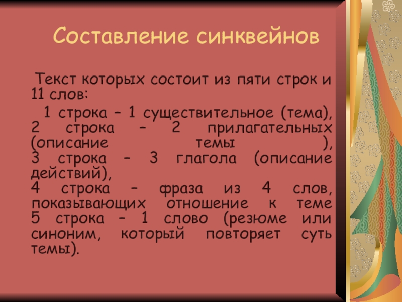 5 строка – 1 слово (резюме или синоним, который повторяет суть темы).
