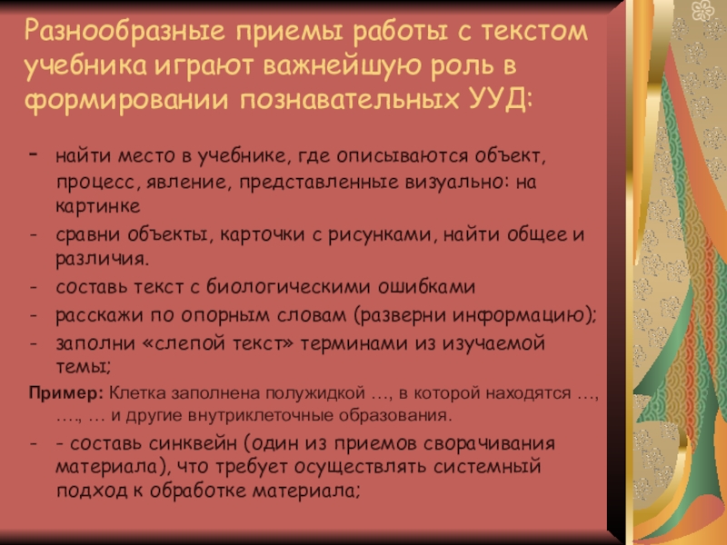 Слайд 17Разнообразные приемы работы с текстом учебника играют важнейшую роль в формировании