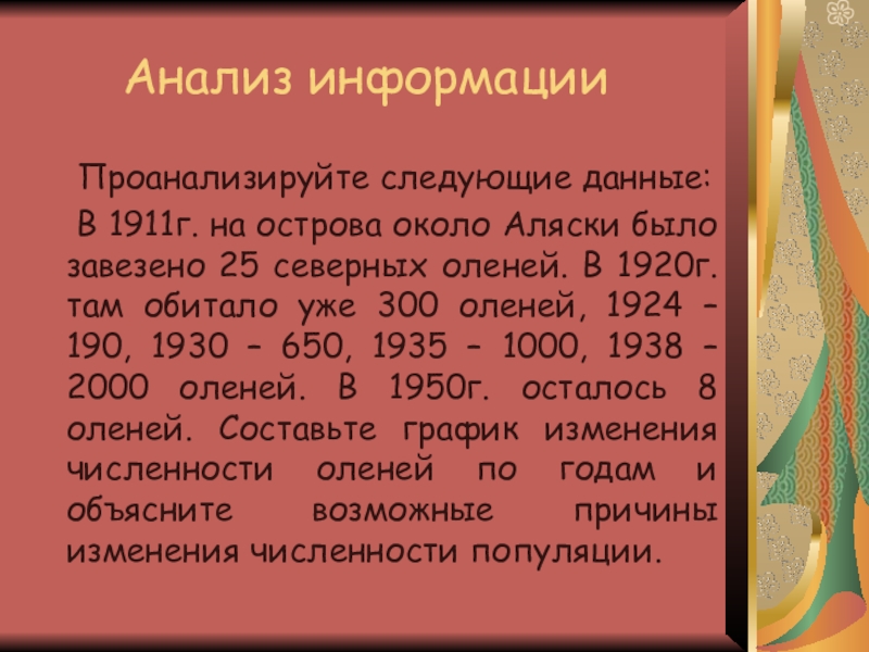 на острова около Аляски было завезено 25 северных оленей. В 1920г. там обитало уже 300 оленей, 1924 – 190, 1930 – 650, 1935 – 1000, 1938 – 2000 оленей. В 1950г. осталось 8 оленей. Составьте график изменения численности оленей по годам и объясните возможные причины изменения численности популяции.