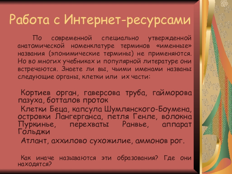 (эпонимические термины) не применяются. Но во многих учебниках и популярной литературе они встречаются. Знаете ли вы, чьими именами названы следующие органы, клетки или их части: