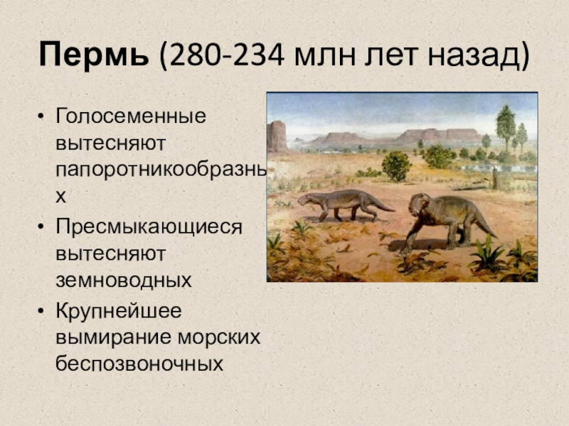 Пермь (280-234 млн лет назад)Голосеменные вытесняют папоротникообразныхПресмыкающиеся вытесняют земноводныхКрупнейшее вымирание морских беспозвоночных