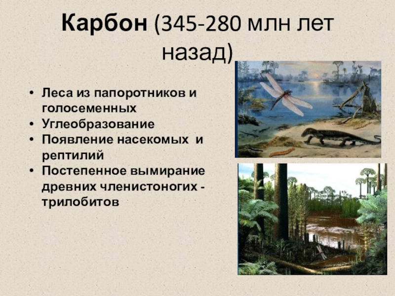 Карбон (345-280 млн лет назад)Леса из папоротников и голосеменныхУглеобразованиеПоявление насекомых и рептилийПостепенное вымирание древних членистоногих - трилобитов