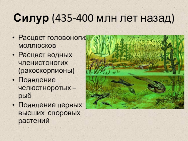 Силур (435-400 млн лет назад)Расцвет головоногих моллюсковРасцвет водных членистоногих (ракоскорпионы)Появление челюстноротых – рыбПоявление первых высших споровых растений