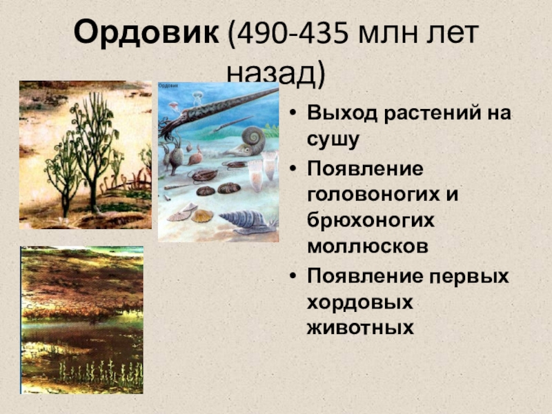 Ордовик (490-435 млн лет назад)Выход растений на сушуПоявление головоногих и брюхоногих моллюсковПоявление первых хордовых животных