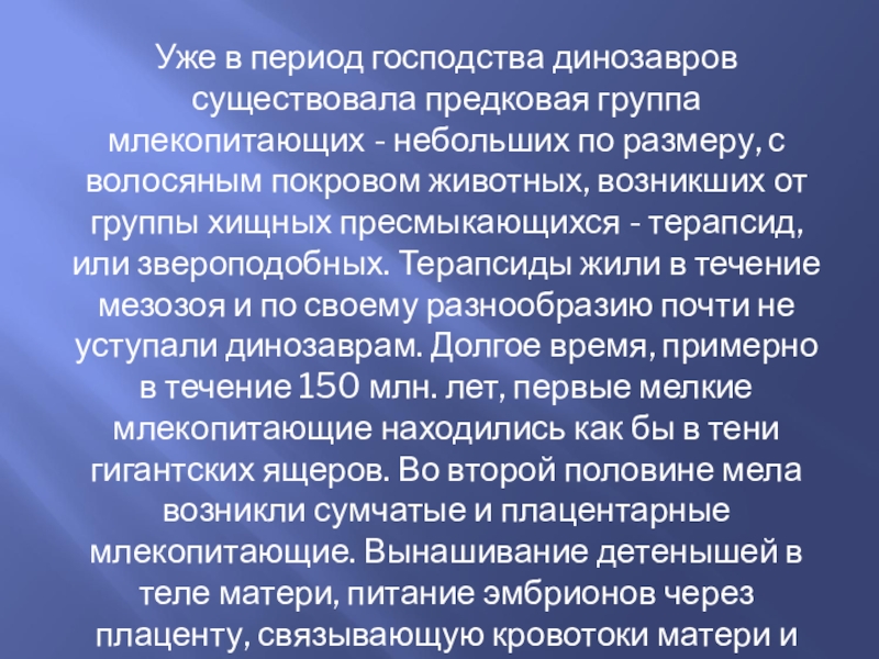 по размеру, с волосяным покровом животных, возникших от группы хищных пресмыкающихся - терапсид, или звероподобных. Терапсиды жили в течение мезозоя и по своему разнообразию почти не уступали динозаврам. Долгое время, примерно в течение 150 млн. лет, первые мелкие млекопитающие находились как бы в тени гигантских ящеров. Во второй половине мела возникли сумчатые и плацентарные млекопитающие. Вынашивание детенышей в теле матери, питание эмбрионов через плаценту, связывающую кровотоки матери и плода - прогрессивные черты организации плацентарных млекопитающих, позволившие им лучше приспособиться к меняющимся условиям существования. Пресмыкающиеся из-за непостоянной температуры тела, откладки яиц находились в большей зависимости от колебаний условий среды и имели ограниченную возможность к распространению. Приобретя живорождение, заботу о потомстве и теплокровность, млекопитающие получили преимущество перед пресмыкающимися. Живорождение, теплокровность, более развитый мозг и связанная с ним большая активность обеспечили прогресс млекопитающих.