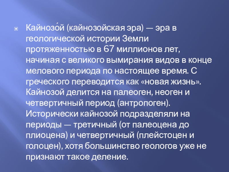 67 миллионов лет, начиная с великого вымирания видов в конце мелового периода по настоящее время. С греческого переводится как «новая жизнь». Кайнозой делится на палеоген, неоген и четвертичный период (антропоген). Исторически кайнозой подразделяли на периоды — третичный (от палеоцена до плиоцена) и четвертичный (плейстоцен и голоцен), хотя большинство геологов уже не признают такое деление.