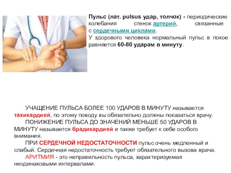 ПОНИЖЕНИЕ ПУЛЬСА ДО ЗНАЧЕНИЙ МЕНЬШЕ 50 УДАРОВ В МИНУТУ называется брадикардией и также требует к себе особого внимания.