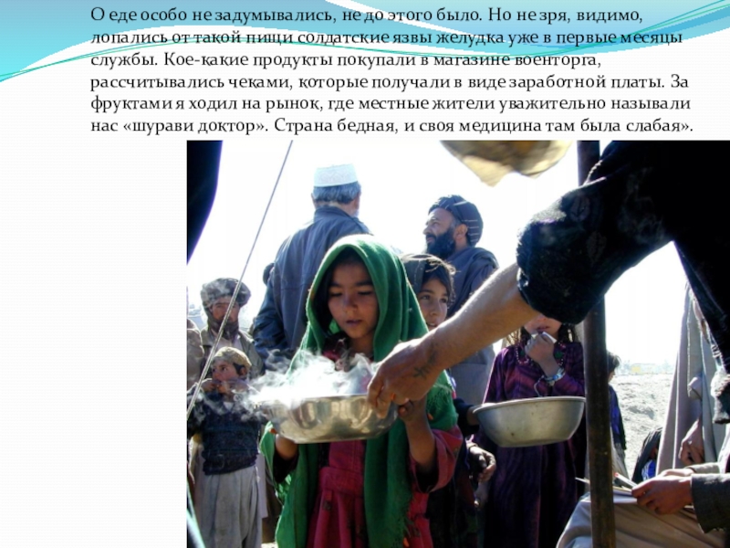 зря, видимо, лопались от такой пищи солдатские язвы желудка уже в первые месяцы службы. Кое-какие продукты покупали в магазине военторга, рассчитывались чеками, которые получали в виде заработной платы. За фруктами я ходил на рынок, где местные жители уважительно называли нас «шурави доктор». Страна бедная, и своя медицина там была слабая».