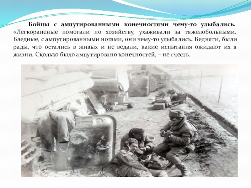 Слайд 15 Бойцы с ампутированными конечностями чему-то улыбались.