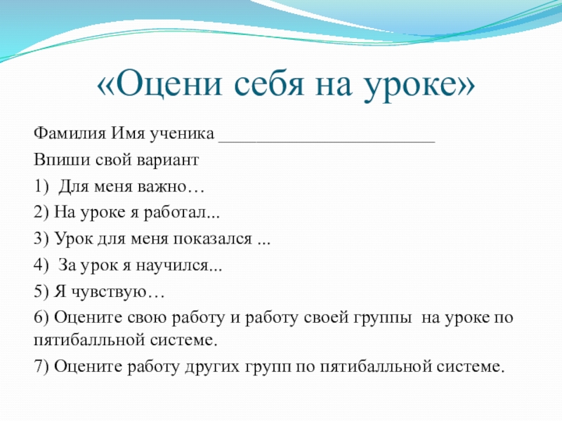 6) Оцените свою работу и работу своей группы на уроке по пятибалльной системе.
