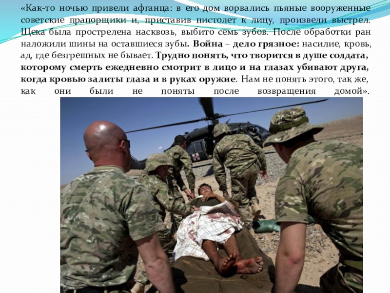 Слайд 19«Как-то ночью привели афганца: в его дом ворвались пьяные вооруженные советские
