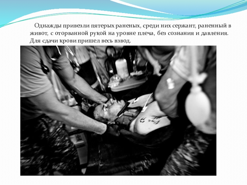 Слайд 16 Однажды привезли пятерых раненых, среди них сержант, раненный в