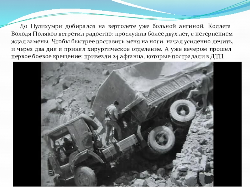 Слайд 14 До Пулихумри добирался на вертолете уже больной ангиной. Коллега