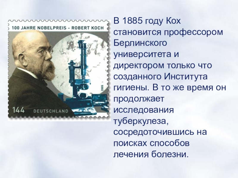 В 1885 году Кох становится профессором Берлинского университета и директором только
