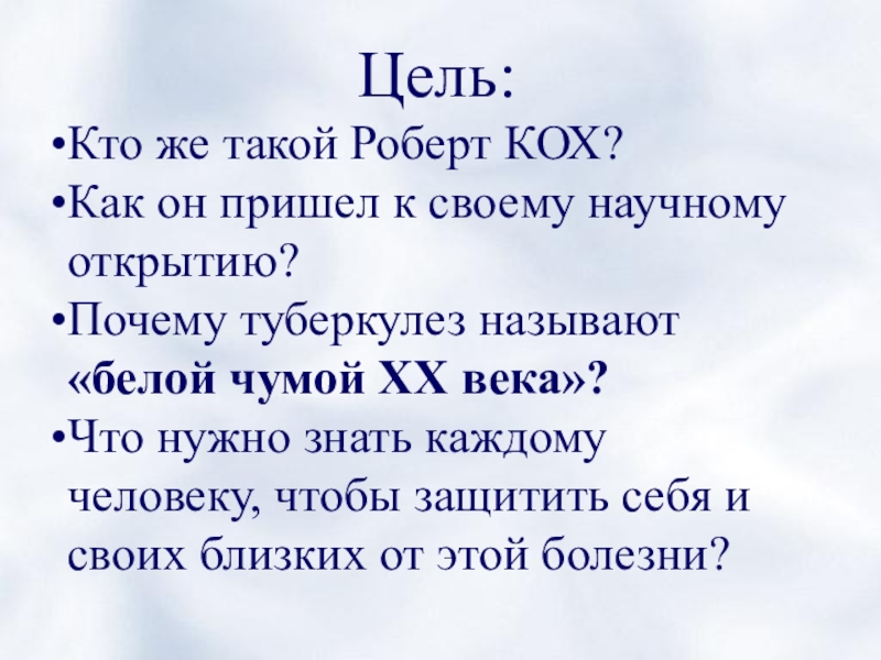 обнаружить возбудителя болезни. Вскоре Кох понимает, что достичь цели можно только с помощью красителей. К сожалению, обычные красители оказываются слишком слабыми, но спустя несколько месяцев безуспешной работы ему всё же удается найти необходимые вещества. Растёртую туберкулёзную ткань 271-ого препарата Кох окрашивает в метиловой синьке, а затем в едкой красно-коричневой краске, используемой в отделке кожи, и обнаруживает крохотные, слегка изогнутые, ярко-сине окрашенные палочки — палочки Коха. 24 марта 1882 года, когда объявил о том, что сумел выделить бактерию, вызывающую туберкулёз. В то время это заболевание было одной из главных причин смертности.