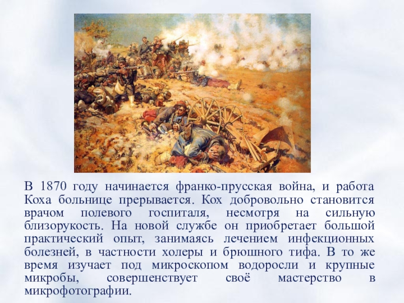 В 1870 году начинается франко-прусская война, и работа Коха больнице прерывается.