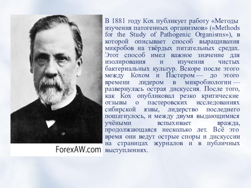 for the Study of Pathogenic Organisms»), в которой описывает способ выращивания микробов на твёрдых питательных средах. Этот способ имел важное значение для изолирования и изучения чистых бактериальных культур. Вскоре после этого между Кохом и Пастером — до этого времени лидером в микробиологии — развернулась острая дискуссия. После того, как Кох опубликовал резко критические отзывы о пастеровских исследованиях сибирской язвы, лидерство последнего пошатнулось, и между двумя выдающимися учёными вспыхивает вражда, продолжающаяся несколько лет. Всё это время они ведут острые споры и дискуссии на страницах журналов и в публичных выступлениях.
