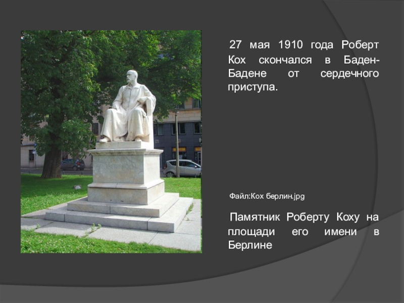 Слайд 17 27 мая 1910 года Роберт Кох скончался в Баден-Бадене от сердечного