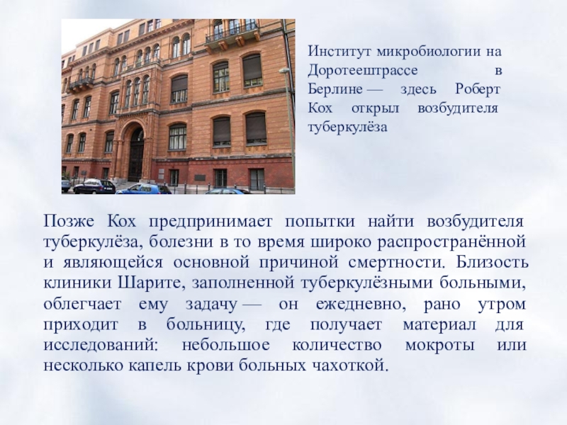 Институт микробиологии на Доротеештрассе в Берлине — здесь Роберт Кох открыл возбудителя