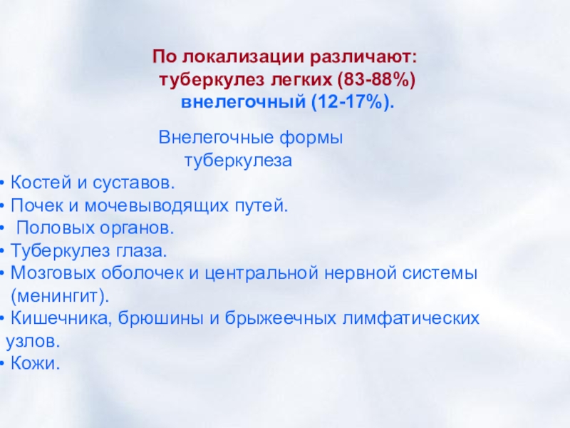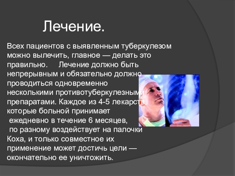физиотерапию, дыхательную гимнастику и препараты, поднимающие иммунитет. Неправильное лечение превращает легко излечимую форму болезни в трудно излечимый лекарственно-устойчивый туберкулез. Хирургическое лечение — удаление части легкого — применяется лишь в запущенных случаях туберкулеза.