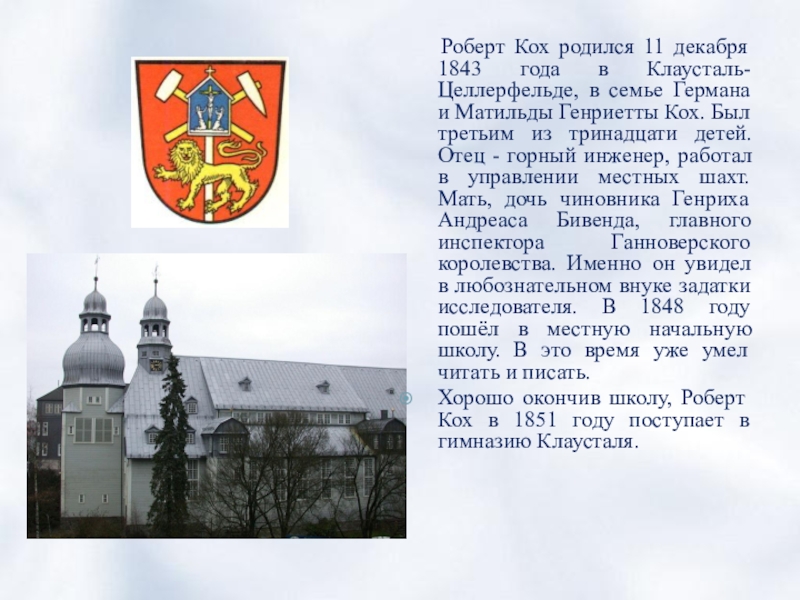 Роберт Кох родился 11 декабря 1843 года в Клаусталь-Целлерфельде, в семье