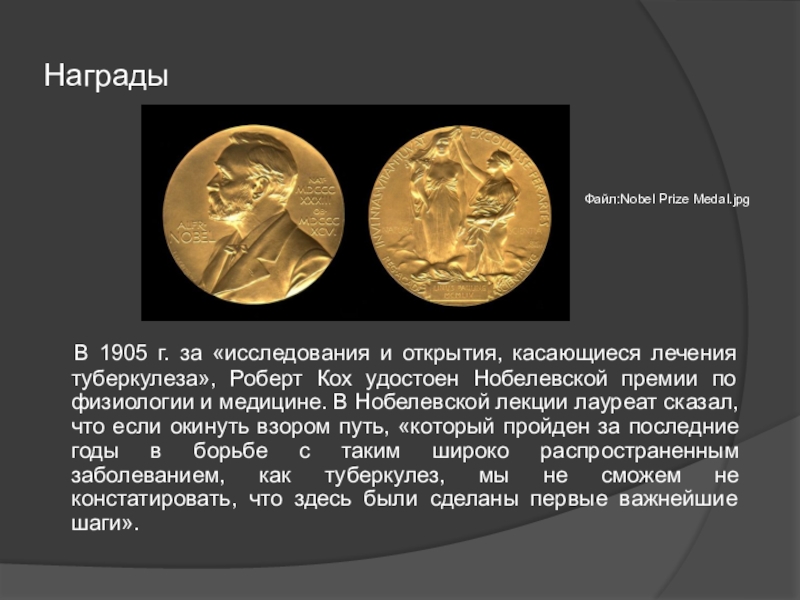 В 1905 г. за «исследования и открытия, касающиеся лечения туберкулеза», Роберт