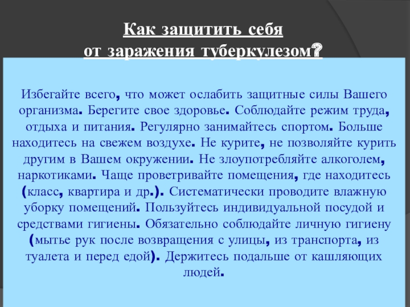 здоровье. Соблюдайте режим труда, отдыха и питания. Регулярно занимайтесь спортом. Больше находитесь на свежем воздухе. Не курите, не позволяйте курить другим в Вашем окружении. Не злоупотребляйте алкоголем, наркотиками. Чаще проветривайте помещения, где находитесь (класс, квартира и др.). Систематически проводите влажную уборку помещений. Пользуйтесь индивидуальной посудой и средствами гигиены. Обязательно соблюдайте личную гигиену (мытье рук после возвращения с улицы, из транспорта, из туалета и перед едой). Держитесь подальше от кашляющих людей.