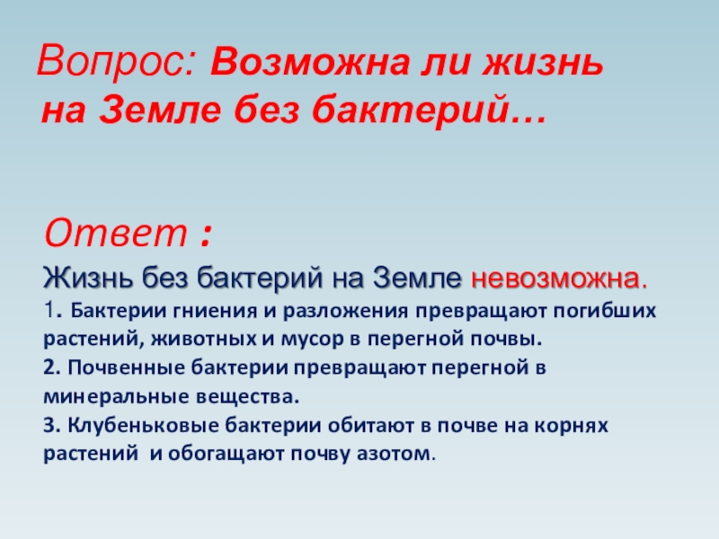 Вопрос: Возможна ли жизнь на Земле без бактерий…