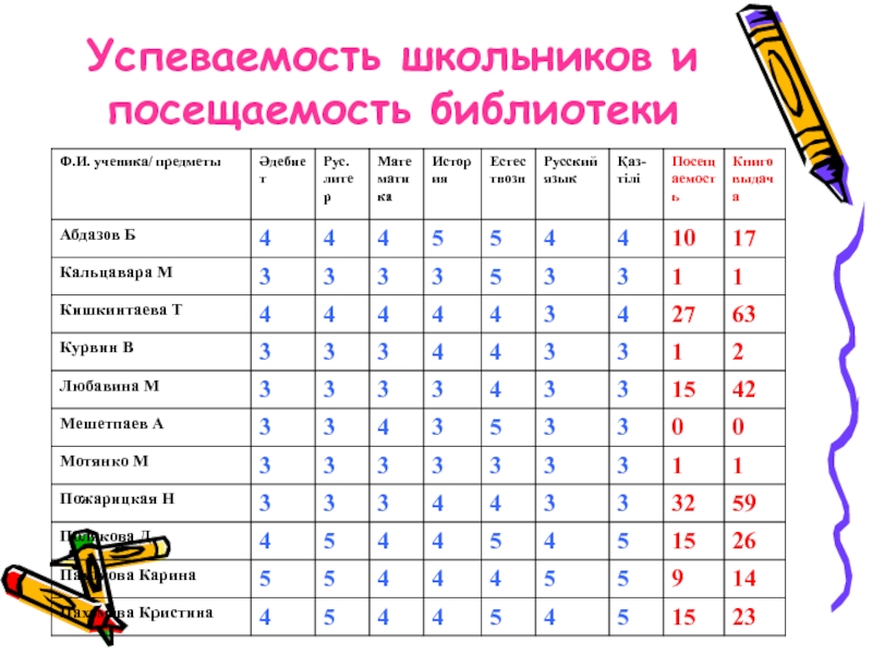 Слайд 8Успеваемость школьников и посещаемость библиотеки