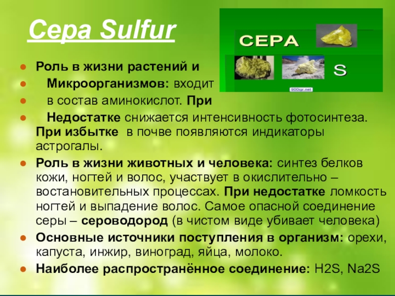 Роль в жизни животных и человека: синтез белков кожи, ногтей и волос, участвует в окислительно –востановительных процессах. При недостатке ломкость ногтей и выпадение волос. Самое опасной соединение серы – сероводород (в чистом виде убивает человека)