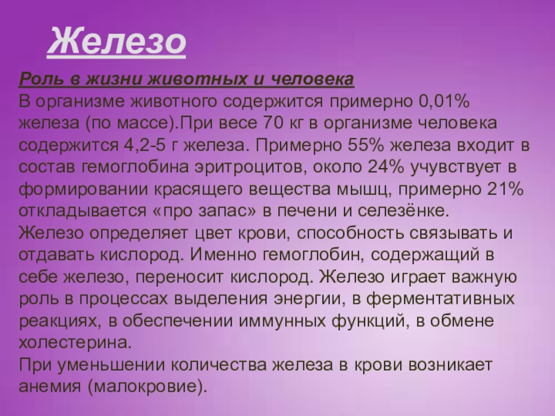 Железо определяет цвет крови, способность связывать и отдавать кислород. Именно гемоглобин, содержащий в себе железо, переносит кислород. Железо играет важную роль в процессах выделения энергии, в ферментативных реакциях, в обеспечении иммунных функций, в обмене холестерина.